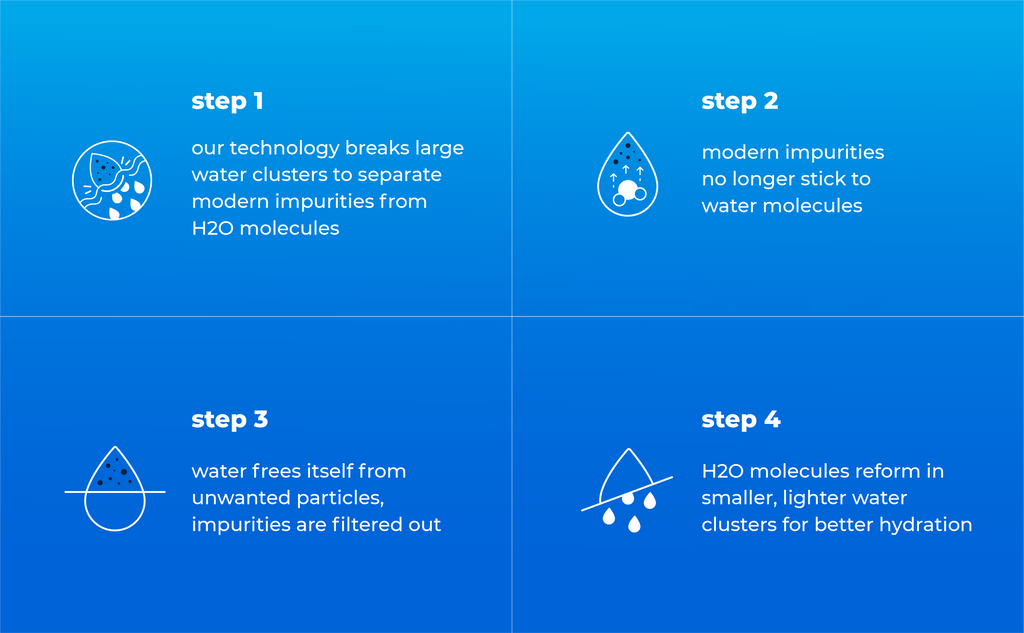 our proprietary technology restores and refines modern water at the molecular level, to bring you crisp, clean, and light water in its simplest form.